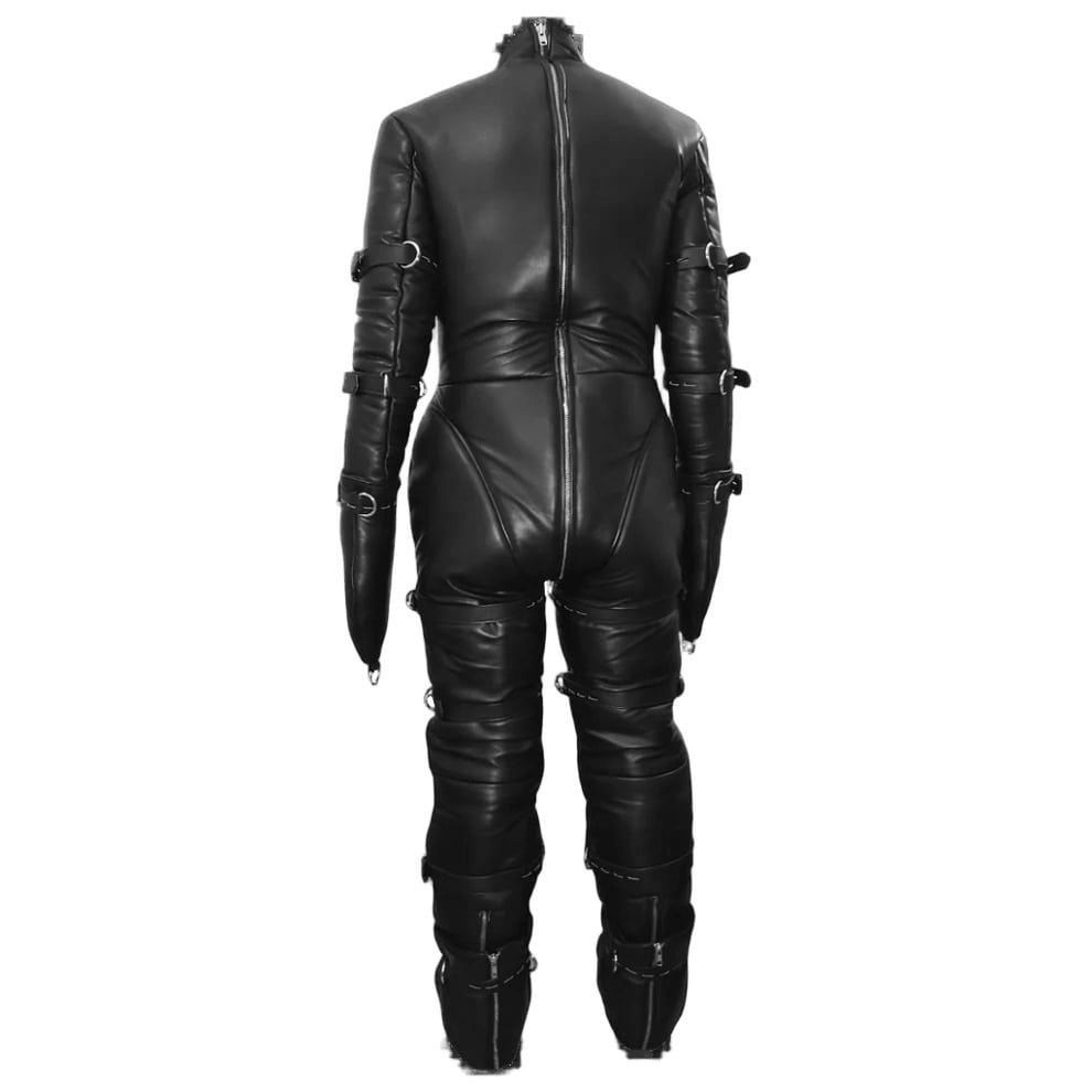 You wont be getting out any time soon with all those one inch straps locked using the lockable buckles. Zips at the wrist and ankles help you get in and out of the suit, along with the main zip that goes from the back collar down the back, through the legs and to the stomach area. You can access any part of the body you want with this zip without the person inside getting out !
